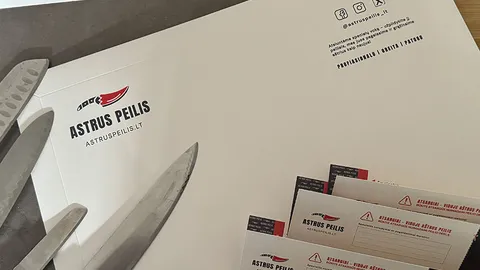 Unikalūs siuntimo vokai (apie 350 vnt.) ir peilių įmautės (apie 1750 vnt.), užsakyti iš Kinijos. Dizaino failai ir tiekėjų kontaktai bus perduoti naujam savininkui.